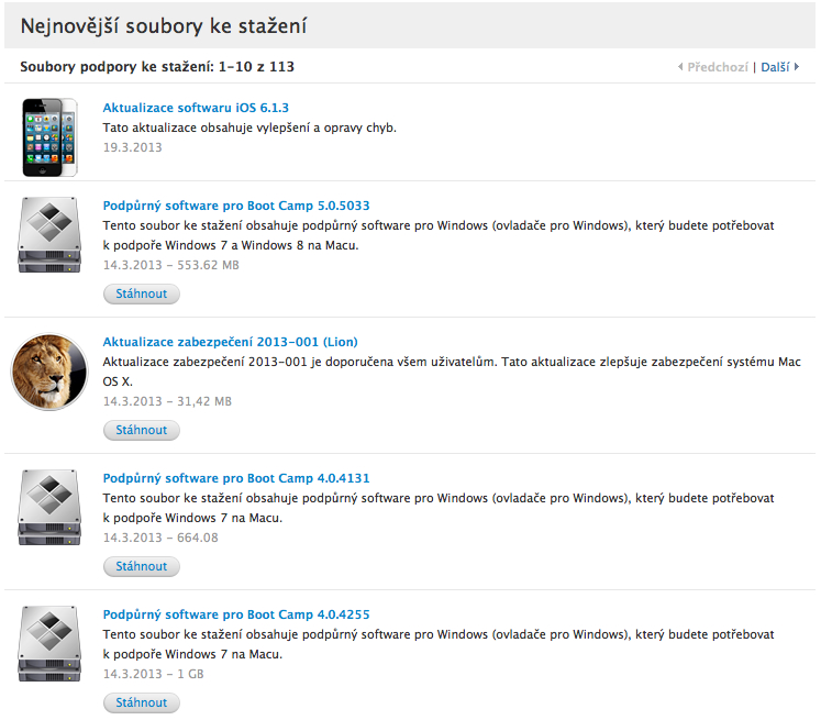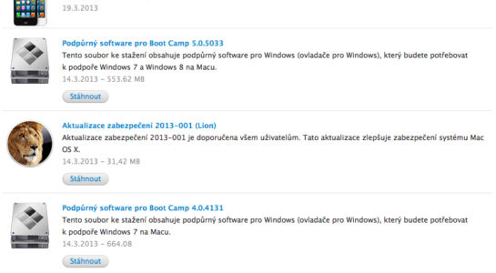 V sekci Podpora totiž najdeme možnost stažení softwarových aktualizací pro produkty společnosti Apple, které jsou nově v češtině a nabízí také český popis. Pokud si tedy chcete pro svůj Mac nebo iOS zařízení něco stáhnout, nemusíte umět anglicky a můžete se podívat přímo na stránky apple.cz, kde se aktualizace objevují sice s menším zpožděním, ovšem zato kompletně s českým popiskem.