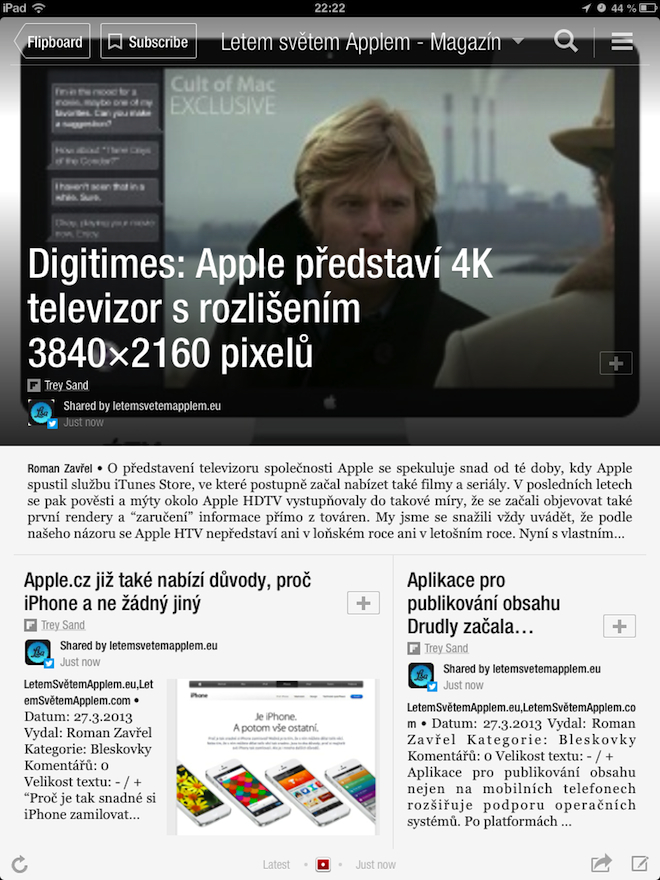 Pokud navíc chcete, můžete časopis sdílet pomocí sociálních sítí a ukázat svým kamarádům články, které vás zajímají. Časopisy jsou navíc k dispozici také v Content Guide, kde můžete najít magazíny dalších uživatelů, které obsahují tematické články. U svých magazínů můžete navíc snadno vytvářet úvodní fotografie, přidávat videa a tak dále. Lze tedy připravit pro ostatní skutečně plnohodnotný časopis, ve kterém budou nejen zajímavé články, ale také další grafické prvky. Flipboard zapracoval samozřejmě také na optimalizaci čtení na iPhone a iPodu touch, díky čemuž je nyní i čtení článků na menším displeji přehlednější než kdy dřív.