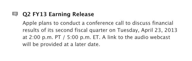 Apple dnes oznámil, že se investoři a veřejnost dozví finanční výsledky za druhé fiskální/první kalendářní čtvrtletí letošního roku 23. 4. 2013, během tradiční audio konference, která bude dostupná přímo na webových stránkách společnosti Apple. Vyhlídky společnosti na toto čtvrtletí nebyly nijak zázračné, což také donutilo investory okamžitě po oznámení plánů na první čtvrtletí letošního roku, snížit hodnotu akcií společnosti. Apple dal tkaé jednoznačně najevo, že se nechystá představit žádný nový produkt, což se následně skutečně stalo a v letošním roce jsme zatím kromě nové 128GB verze tabletu iPad neviděli jedinou novinku. Na druhou stranu uzavřela společnost dohodu s americkým T-mobile. Uvidíme tedy, jak se první čtvrtletí podepsalo na ziscích společnosti, žádné ohromující výsledky však zřejmě očekávat nemůžeme, i když pro Apple jsou průměrné výsledky ty, které jsou pro ostatní společnosti doslova z říše snů.