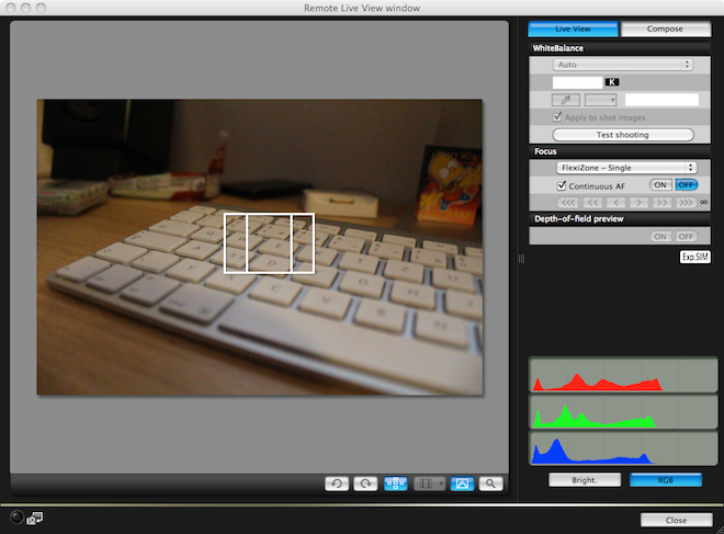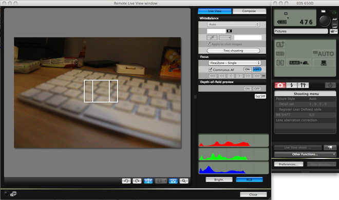 V reálném čase vidíte také RG barevnost, případně světelnost a další zajímavé věci. Pokud se tak učíte fotit, můžete si vše studovat přímo na displeji svého počítače a v reálném čase vidíte všechny změny. Nastavení fotoaparátu a všech jeho funkcí je možné provádět pomocí aplikace EOS utility stejně jako na samotném přístroji. Jedinou nevýhodou je fakt, že obraz ze zrcadlovky přenášený na plochu vašeho počítače je značně nekvalitní. V podstatě je kvalita obrazu stejná, jako při použití kamery iSight vestavěné v MacBooku. Samozřejmě se však jedná pouze o živý náhled na displeji a v momentě kdy pořídíte fotografii, je v plné kvalitě tak jak máte fotoaparát nastaven. Navíc s tím ,že je okamžitě přímo ve vašem počítači a můžete tak fotografii okamžitě upravit a zhodnotit.