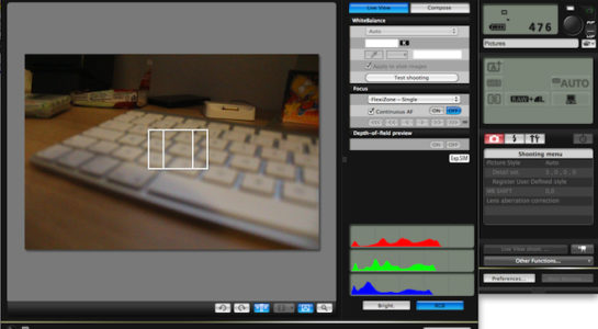 V reálném čase vidíte také RG barevnost, případně světelnost a další zajímavé věci. Pokud se tak učíte fotit, můžete si vše studovat přímo na displeji svého počítače a v reálném čase vidíte všechny změny. Nastavení fotoaparátu a všech jeho funkcí je možné provádět pomocí aplikace EOS utility stejně jako na samotném přístroji. Jedinou nevýhodou je fakt, že obraz ze zrcadlovky přenášený na plochu vašeho počítače je značně nekvalitní. V podstatě je kvalita obrazu stejná, jako při použití kamery iSight vestavěné v MacBooku. Samozřejmě se však jedná pouze o živý náhled na displeji a v momentě kdy pořídíte fotografii, je v plné kvalitě tak jak máte fotoaparát nastaven. Navíc s tím ,že je okamžitě přímo ve vašem počítači a můžete tak fotografii okamžitě upravit a zhodnotit.