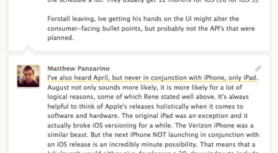 Rene Ritchie, šéfredaktor TiPb.com a Matthew Panzarin, redaktor Thenextweb.com se shodují v tom, že nové iPady uvidíme v dubnu, tedy již tento měsíc, ale také v tom, že nového iPhone se dočkáme v srpnu letošního roku. To je však podle nás velmi nepravděpodobné a Apple jak víme z minulosti raději počká, až budou všichni doma z dovolených a prázdnin, aby mohl oznámit novinku před co největším publikem, tedy aby média oslovila s novým produktem co největší počet lidí.