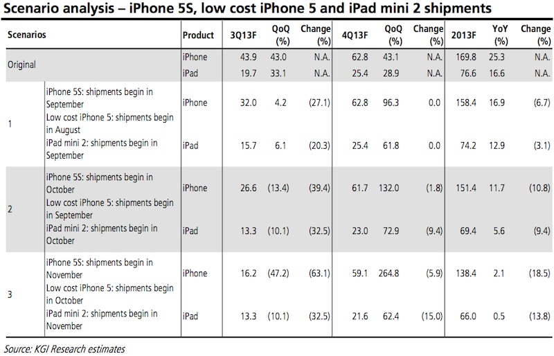 Podľa analytika za odložením týchto zariadení stojí jeden základný problém – problém s výrobou komponentov. V prípade iPhone 5S za najväčší problém považuje práve očakávaný senzor odtlačkov prstov, s ktorým má Apple údajne problémy z hľadiska hardvéru i softvéru. Apple musí podľa neho správne vyladiť farby tak, aby zaznamenávanie odtlačkov nebolo problematické a v neposlednom rade musí priniesť podporu technológie do systému iOS 7. Problém budgetového iPhonu bude podľa Kua v posadnutosti Applu priniesť čo najtenšie zariadenie. Práve toto môže spôsobiť problémy s výrobou plastového krytu, ako aj so stavbou prístroju. Posledným problémom pre Apple by mal byť Retina displej pre druhú generáciu tabletu iPad, ktorý pravdepodobne bude niesť meno iPad mini s Retina displejom. Práve on v kombinácii s tenkosťou zariadenia môže spôsobiť, že sa výroba zariadenia oneskorí a môžeme sa ho dočkať až v priebehu leta, podobne ako v prípade ostatných dvoch prístrojov. Zároveň však nevylučuje ani tri ďalšie scenáre, kedy Apple vypustí do obehu svoje zariadenia v časovom rozmedzí August – September, September – Október, Október – November.