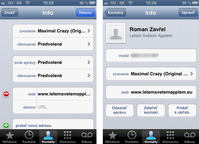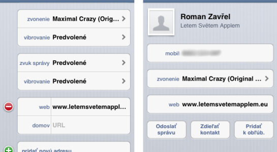 Apple sa navyše rozhodol používateľom prácu do budúcna uľahčiť a ihneď po tom, ako si u kontaktu nastavíte vlastné vyzváňanie, sa vám táto voľba objaví priamo na obrazovke s kontaktom, kde v budúcnosti môžete zvonenie zmeniť veľmi rýchlo. Behom upravovania ste si mohli všimnúť, že sa v tejto menšej sekcii možností nachádza aj možnosť zvolenia vlastného typu vibrovania či dokonca možnosť nastaviť vlastný zvuk textovej správy, ako aj vibrovanie pri príchode správy od tohto kontaktu. O tom, ako môžete vytvoriť vlastné vibrovanie v systéme iOS 6, sa môžete viac dočítať priamo tu. V prípade, že ešte používate iOS 5, prečítajte si návod Jak si v iOS 5 vytvořit vlastní vibrační vyzvánění.