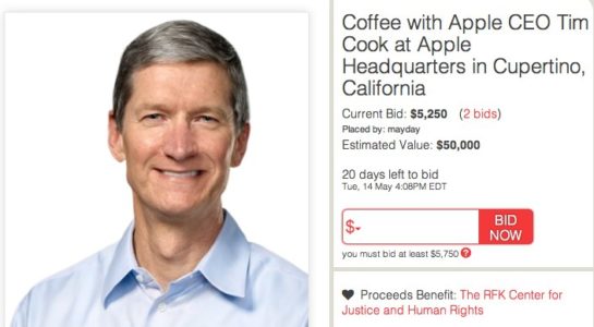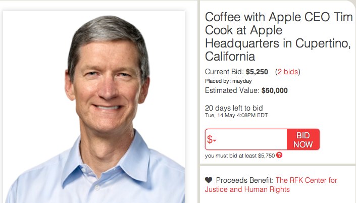 Tim Cook totiž už dávnejšie na konferencii D10 vyhlásil, že Robert F. Kennedy, inak známy aj pod menom Bobby Kennedy, je jedným z jeho historických hrdinov. Nová aukcia, ktorá končí už 14. mája 2013, sľubuje posedenie u kávy s CEO Timom Cookom priamo v sídle spoločnosti Apple na 1 Infinite Loop v Cupertine, Kalifornii. Stretnutia sa majú zúčastniť dve osoby, pričom tento míting by trval v rozmedzí 30 až 60 minút. Dátum stretnutia si určia víťazi aukcie.