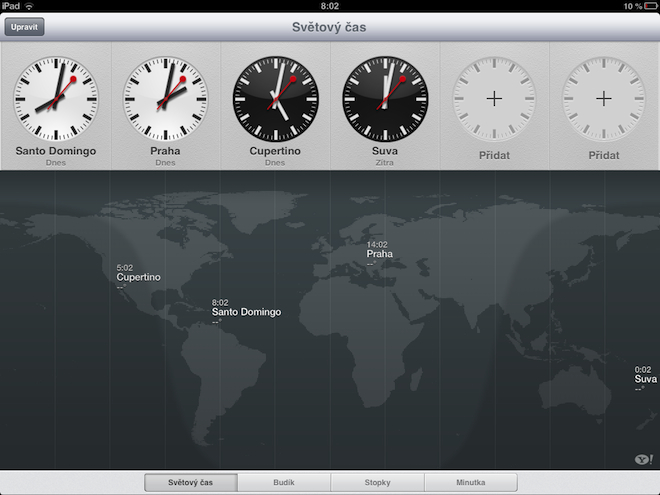 iPad stejně jako iPhone nabízí zobrazení několika světových časů, oproti iPhone má však jednu výhodu, díky které máte okamžitě přehled o tom v jaké fázi dne se dané město nebo země právě nachází. V podstatě stejnou vizualizaci nabízí také naprostá většina letadel na svých displejích během letů při kterých překračujete časové pásma. Zde však musíme narovinu přiznat, že to Apple se svým minimalistickým designem přehnal a v letadle je vizualizace mnohem přehlednější.