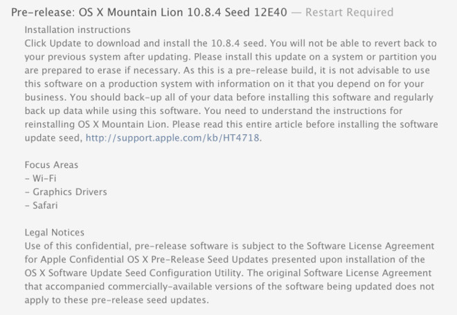 Podobne ako v prípade OS X Mountain Lion 10.8.3, tak aj v prípade ďalšieho update, označeného ako OS X 10.8.4, prebieha jeho celkom dlhý beta test. Apple totiž pred niekoľkými minútami rozposlal vývojárom v poradí už piaty build svojho budúceho systému, ktorý nesie označenie 12E40. V priebehu minulého týždňa rozposlal vývojárom verziu 12E36, ktorej popis je identický s tým, ktorý sa nachádza u novej beta verzie. Spoločnosť žiada vývojárov, aby sa zamerali na grafické ovládače, Safari a WiFi.