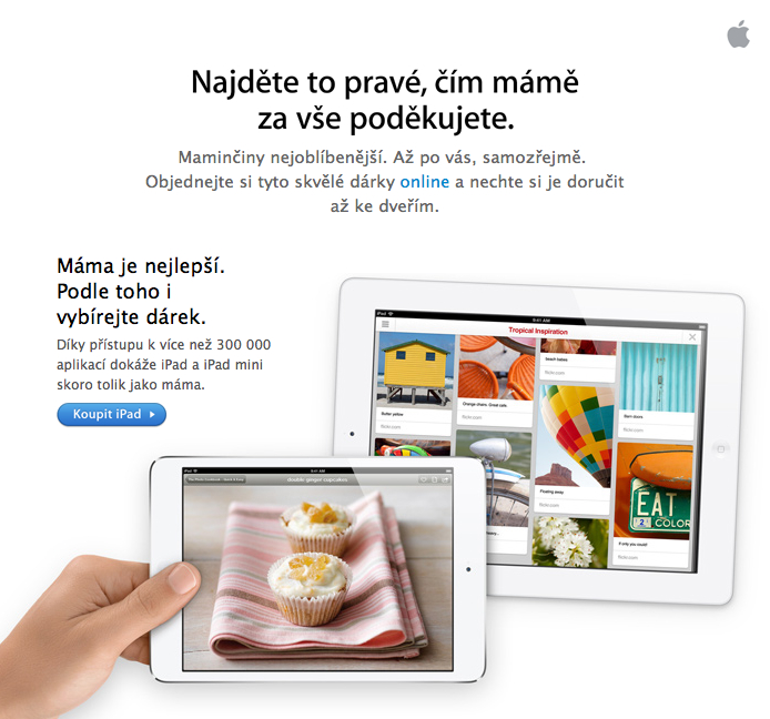 Apple.cz již před několika dny začal na svých stránkách upozorňovat na den matek, při jehož příležitosti můžete svoji maminku obdarovat některým z produktů na apple.cz. Dnes se nabídka dostala také na maily zákazníků společnosti Apple a kromě iPadů v ní Apple prezentuje také krokoměr Fitbit, ale i několik obalů a dokonce i MacBook Air. Pokud tedy chcete svojí mámu potěšit, Apple vám to usnadní a ty nejzajímavější dárky rozeslal dnes formou newsletteru všem registrovaným zákazníkům.  Nezapomeňte, den matek je letos 13. 5. 2013.