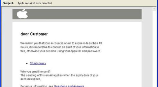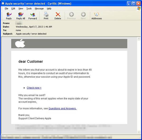 V tomto prípade stránka zistila, že podvodníci v e-mailoch odkazovali vo svoj prospech na 110 webových stránok, pričom všetky z nich boli zaregistrované na IP adrese 70.86.13.17 v Houstone. Zlodeji sa v tomto prípade snažia na seba upozorňovať množstvom výrazných gramatických chýb v e-mailovej správe, ako aj zvláštnou vizuálnou stránkou správy, ktorá neodpovedá bežným e-mailom od Applu či jeho technickej podpory. Ukážku takéhoto e-mailu môžete vidieť na obrázku nižšie.