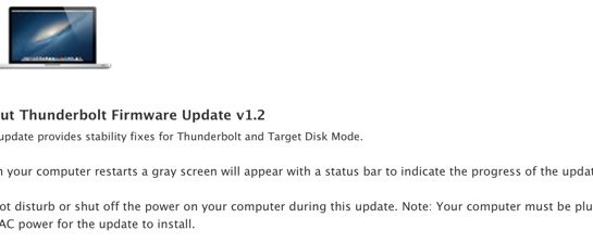 Apple vydal aktualizaci firmware pro Thunderbolt port, která je dostupná pro všechny Macy s Thunderbolt portem. Aktualizace přináší zvýšení stability a opravuje funkci Target Mode. Aktualizace je dostupná pro OS X 10.8.3 nebo novější, můžete ji stáhnout přes službu Mac App Store nebo přímo zde.