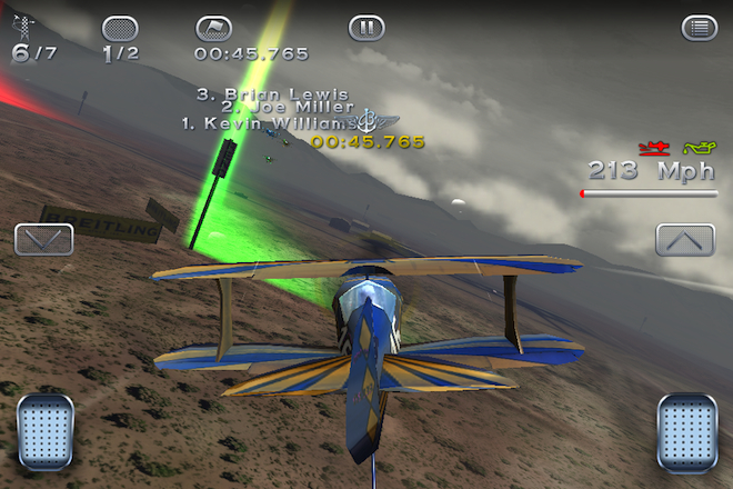 Hra totiž kromě klasického singleplayeru při kterém si vyberete stroj, počet soupeřů, počet kol, dráhu, obtížnost, počasí a období dne ve kterém chcete letět, nabízí také multiplayer. Právě zde se setkáte s množstvím hráčů přes Game Center, kteří budou minimálně prvních pár dní až týdnů skutečně někde jinde než vy a to z jediného důvodu, mají natrénováno. Čas vám samozřejmě během každého závodu měří legendární Breitlingy a tak pokud patříte mezi milovníky této značky, přijdete si na své.