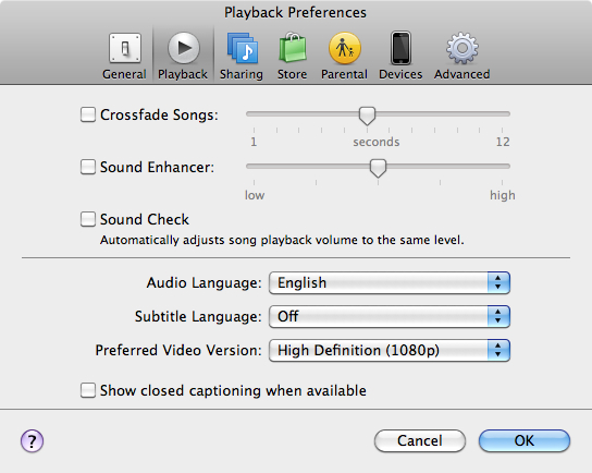 I nastavení samotného přehrávače iTunes má velký vliv na kvalitu přehrávaných skladeb. V samotném iTunes můžete kromě změny nastavení ekvalizéru přispět k lepší kvalitě zvuku tím, že vypnete dvojici funkcí, které se sice snaží být užitečným pomocníkem při přehrávání, ovšem díky tomu upravují také kvalitu výsledného zvuku. V menuBar tedy vyberte iTunes a Settings, kde následně v sekci Playback vypněte (nesmí být zaškrtnuty) funkce Sound check a Sound Enchancer. Pokud tyto dvě funkce vypnete, zajistíte, že iTunes přehrává hudbu ve stejné kvalitě v jaké jste ji do hudební knihovny nahráli a výsledná reprodukce není již softwarově ničím ovlivněna, tedy až na ekvalizér.