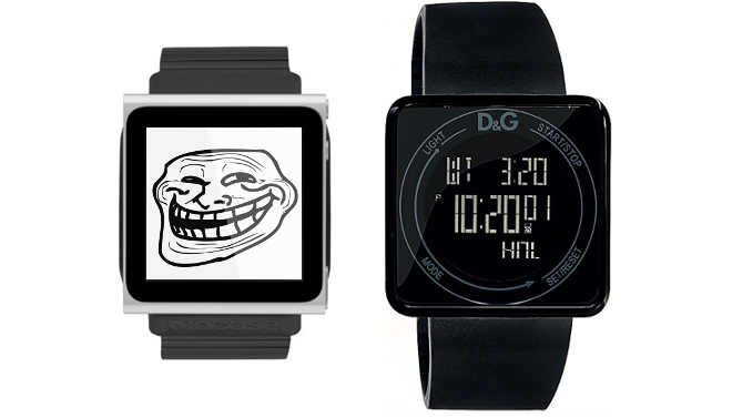 Apple si však z ľudí jednoducho vystrelil. To, čo môžeme vidieť na ruke užívateľa a to, čo vyzerá ako iné rozmiestnenie portov na zariadení, v skutočnosti nie sú hodinky iWatch. Apple totiž schválne v reklame použil istý model hodiniek DW0734 od Dolce & Gabbana, ktoré sú špecifické najmä pre svoj tvar a dotykový displej. Určitá podobnosť s iPodom nano 6. generácie vyvolala špekulácie, že spoločnosť predčasne predstavila hodinky, ktoré by podľa špekulácií mala predstaviť na konferencii WWDC 2013. Žiaľ, hodinky od D&G nemajú žiadny port, žiadne úložisko a pokiaľ ste reklamu sledovali pozorne, mohli ste si všimnúť nenápadne ukrytý iPhone 5. Ten sa nachádza za pohármi, vďaka čomu dáva scéna dôraz práve na hodinky so skleneným dotykovým displejom. Apple si tak z užívateľov vystrelil, získal väčšiu pozornosť a zároveň naznačil, že možno skutočne pripravuje inteligentné hodinky iWatch.