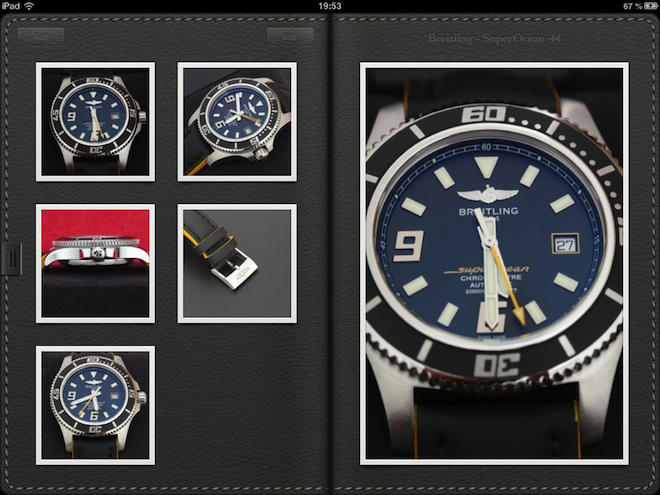 To samozřejmě vědí také vývojáři aplikací a tak v iTunes App Store naleznete stovky aplikací, díky kterým si svoji reálnou kolekci hodinek přenesete také do virtuální podoby. Aplikace která mě skutečně nadchla nese jednoduchý název Watches. Jedná se o virtuální dřevěný bos, do kterého si uložíte fotografie hodinek jenž vlastníte. Kdyby však spočíval účel aplikace pouze v uložení fotografií, příliš užitku by nepřinášela. Kromě toho že si můžete box barevně přizpůsobit zcela vašim představám, spočívá jeho hlavní smysl v tom, že k nahraným fotografiím hodinek můžete přidat veškeré potřebné informace.
