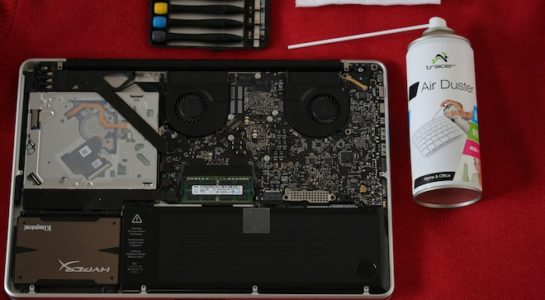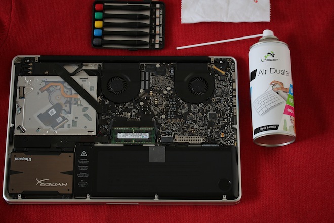 Nejprve si přečtete odstavec před čištěním. Počítače MacBook Pro u kterých je možné vyměnit disk a RAM jsou nejlépe čistitelné počítače z celé rodiny Apple. Bez ztráty záruky totiž můžete odšroubovat celý spodní kryt počítače a ten pak krásně vyfoukat stlačeným vzduchem. Nejprve však očistěte pomocí stlačeného vzduchu klávesnici a porty počítače. Následně odmontujte kryt a vyfoukejte všechny části, včetně těch, které na první pohled s chlazením nesouvisí. Samozřejmě pečlivě vyfoukejte také ventilátory a zadní část, která k nim přivádí vzduch. Postupně zbavte všechny vnitřní části počítače prachu a nečistot. Přišroubujte spodní kryt, nechte počítač pár minut odpočinout a poté jej začnete používat.
