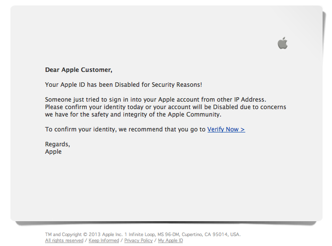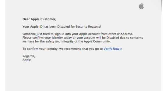 Několik našich čtenářů a můj dobrý kamarád mi dnes přeposlali mail, ve kterém se podvodníci vydávají za společnost Apple. Autoři v mailu vyzývají k přihlášení na Apple ID účet na stránkách, které jsou k nerozeznání od oficiálních stránek společnosti Apple a svoji žádost zdůvodňují tím, že se někdo pokoušel přihlásit na váš účet z cizího Apple ID. Pokud zadáte přihlašovací jméno a heslo, útočník automaticky získá tyto údaje do své databáze a může Apple ID zneužít a dostat se tak například v případě kdy používáte iCloud nebo iMessage k velmi citlivým údajům!