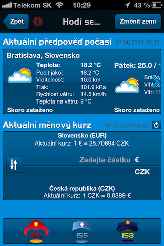 Co je poměrně škoda je fakt, že si smluvní podmínky u konkrétního pojištění nemůžete přečíst předtím, ale dojdou Vám až v emailu se smlouvou. Rozumím tomu, že drtivá většina klientů tuto smlouvu nebude číst, ovšem tato možnost mi zkrátka chybí a věřím, že ji vývojáři doplní. Sympatická je také položka v menu Hodí se, kde okamžitě vidíte počasí v destinaci do které se hodláte vydat, aktuální kurz s možností přepočtu vámi zadané částky a také důležitá telefonní čísla na které opět můžete přímo z aplikace telefonovat. Pojištění je rozhodně dobrá věc a i když s našimi pojišťovnami nemusíte s úhradou odškodného v nějakých vyšších částkách souhlasit, máte jistotu že vám nepříjde účet z nemocnice na několik milionů korun, ale o léčebné výlohy nebo další účty se postará pojišťovna. Aplikace je jednou z těch užitečných v App Store a pojištění si sjednáte doslova v letadle před odletem.