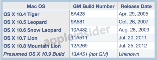 Před WWDC se objevují čím dál tím zajímavější informace, které již nejsou pouhou spekulací, ale fakty. Nikdo nepochybuje o tom, že právě na WWDC se objeví poprvé nová verze operačního systému Apple OS X 10.9. Vývojáři však nyní upozornili server Appleinsider na jednu zajímavou informaci, na počet testovacích sestavení. Na níže uvedeném obrázku vidíte takzvané GM Build Number, tedy čísla testovacího sestavení u Golden Master verzí jednotlivých operačních systémů společnosti Apple. Golden Master verze jsou obvykle poslední testovací verze software, které se následně v téměř nezměněné podobě dostávají přímo ke koncovým uživatelům.