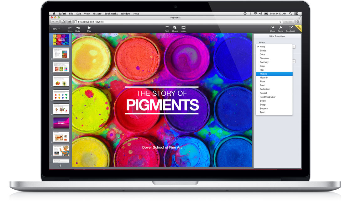 Do tretice sa v iCloude objaví aj ikona populárneho nástroju na tvorbu prezentácií, Keynote. Webová verzia Keynote svojimi možnosťami hravo prekonáva konkurenčný PowerPoint Web App a to predovšetkým funkciami. K dispozícii je opäť niekoľko predpripravených šablón, ktoré môžeme poznať z verzie pre iOS a Mac, zároveň však ponúka veľké množstvo prechodov a animácií. Zatiaľ čo možnosti, ktoré ponúka konkurencia, je možné spočítať na jedinej ruke, V prípade Keynote nepostačia ani dve ruky. Pokiaľ potrebujete vašu prezentáciu prezentovať v pôvodnej forme a zároveň nemáte po ruke váš počítač, vďaka Keynote for iCloud bude možné prehrať prezentácie priamo cez web. Používatelia budú mať po ruke možnosť editovať časovanie animácií, ako aj správne rozložiť text a medzery. Kompatibilita s PowerPoint je samozrejmosťou.