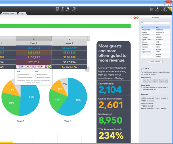 Funkciami nezaostáva ani Numbers a v súčasnej dobe jeho cloudová verzia ponúkne okrem kompatibility s Excel aj predpripravené šablóny a ďalšie užitočné vlastnosti. Okrem možnosti úpravy vzhľadu budú používatelia môcť narábať s tabuľkami, tvarmi a obrázkami. Samozrejmosťou je tiež viac ako 250 matematických funkcií, vďaka ktorým Numbers automaticky vykoná matematické operácie za vás. Taktiež je možné obsiahnuť v dokumente niekoľko hárkov.