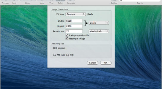 Když jsme včera zveřejnili odkaz na stažení nového pozadí pro OS X 10.9 Mavericks přímo z Apple.com, zřejmě většina čtenářů kteří měli o tento wallpaper zájem jen pozadí stáhla a nastavila. Pokud si jej však otevřete například v Preview a zvolíte možnost upravit velikost, zjistíte že je pozadí skutečně obrovské, tedy že je konkrétně v rozlišení 5120×2880 pixelů, což je rozlišení které se předpokládá u iMac Retina a Apple Thunderbolt Display Retina. Jedná se přesně o dvojnásobek výšky a šířky rozllišení 2560×1440 pixelů, které nalezneme v dnešním 27″ iMacu a Apple Thunderbolt Display.