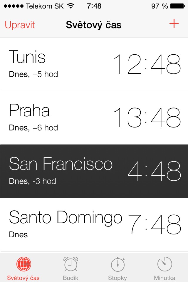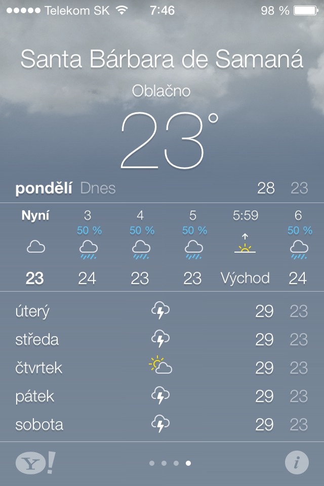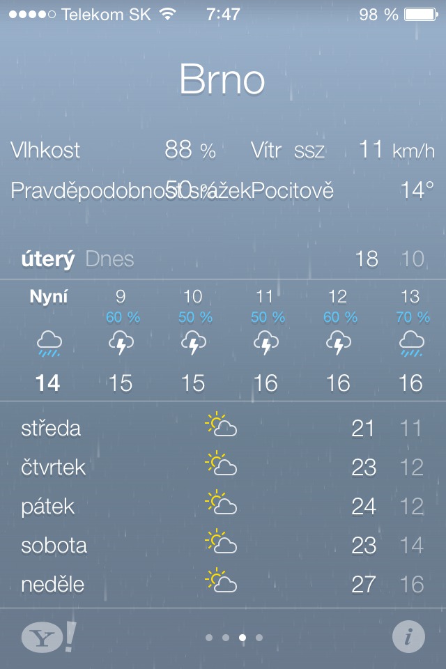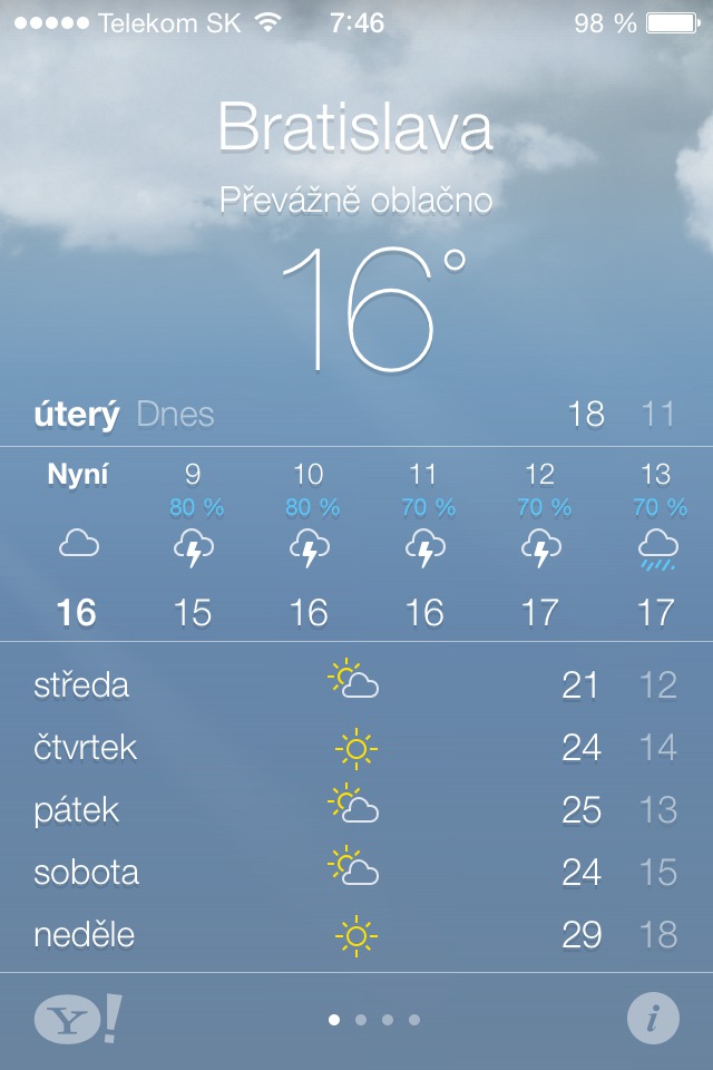 3. Poslední skupinou jsou mí rodiče. Oba v důchodu a ve věku atakujícím hranici 75 let. Už při iOS 6 měli problém s rozpoznáním některých funkcí a tlačítek, a to co do výraznosti grafiky byl iOS 6 velmi přehledný a kontrastní. Když se teď dívám na některé screenshoty z nového iOS 7, jsem přesvědčený, že čitelnost pro lidi se zhoršeným zrakem bude velmi nepříjemná. Například počasí, které můj táta sleduje dost často, je špatně čitelné i pro mě. Font Helvetika je elegantní a jeho tenké linie jsou sexy, nicméně v bílé barvě na bílošedých mracích jsou jeho kontury opravdu velmi špatně rozpoznatelné, zejména pak v malé velikosti u předpovědi na následující dny!