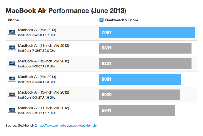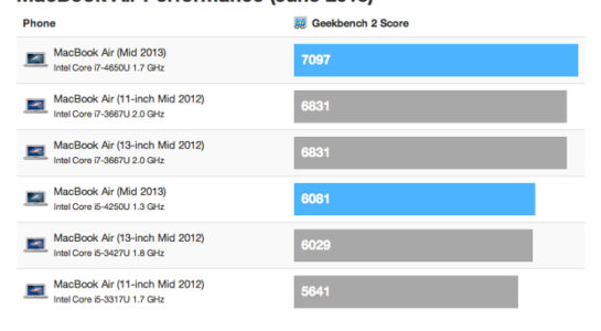 Apple sa aj naďalej rozhodol ponúkať výkonnejší model s výkonnejším procesorom, ktorý teraz poskytuje frekvenciu 1.7 GHz. Zatiaľ čo predchádzajúce modely s taktom na 2GHz získali hodnotenie 6831 bodov, nový model s procesorom Haswell a nižšou frekvenciou získal hodnotenie 7097 bodov, ktoré je o viac ako 250 bodov vyššie.