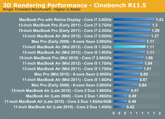 Napriek tomu, že sa Apple rozhodol použiť procesor Intel Core i5-4250U s papierovo nižšou frekvenciou, podľa testov sa udržuje výkon zariadenia na takmer rovnakej úrovni ako jeho predchodca, teda frekvencia nemá veľký vplyv na výkon zariadenia. Oproti predošlej generácii došlo k zníženiu výkonu o 5%, za čo môže predovšetkým kombinácia maximálnej Turbo Boost frekvencie, chladenia a základnej frekvencie. V prípade integrovaného grafického čipu došlo k zníženiu frekvencie grafického jadra z 350 na 200MHz, pričom vo vnútri nájdeme čip Intel HD 5000.
