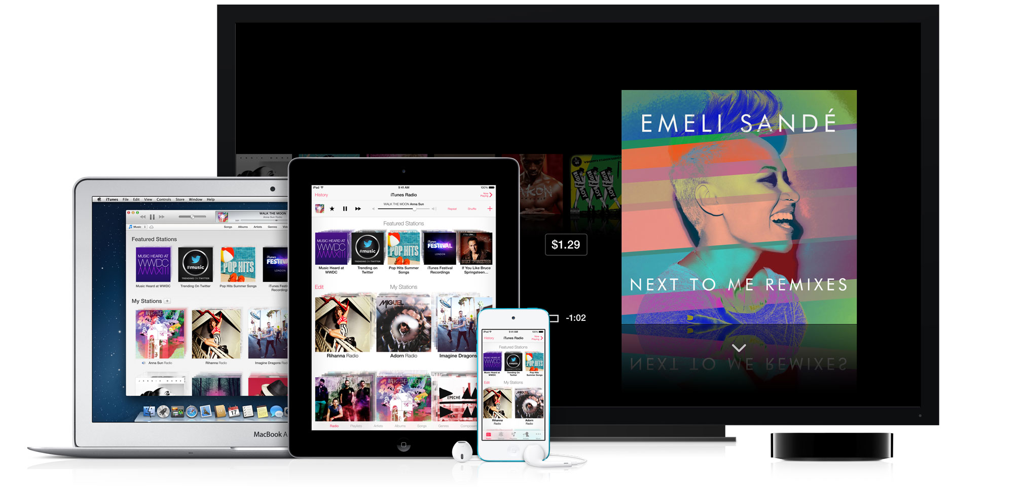 Doposiaľ jedinou aplikáciou, ktorej vzhľad už poznáme, je aplikácia Hudba. Apple mimo iného spustil pomerne obsiahlu informatívnu stránku ohľadom svojej služby iRadio, na ktorej mimo iného ukazuje aplikáciu v prehrávači iTunes, na obrazovke Apple TV a v neposlednom rade aj na obrazovke veľkého iPadu. Práve na veľkej obrazovke môžeme vidieť, že sa dizajnérsky tím Jonyho Iva rozhodol zachovať takmer identický vzhľad tomu, s ktorým sa môžeme stretnúť na iPhone so systémom iOS 7. Pri pohľade na snímok si však myslíme, že sa vzhľad aplikácie veľmi podobá tomu, ktorý vidíme na obrazovke iPadu už dnes, stráca však akékoľvek nadbytočné grafické prvky. Miesto nich tak v spodnej časti obrazovky nájdeme šedé a červené slová. Zmienky o vyhľadávacom poli nevidíme, je teda možné, že sa nachádza na inom mieste.