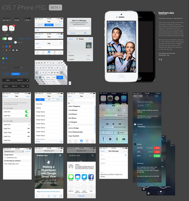 Pokiaľ patríte k tým, ktorí pracujú s grafikou a chcete vo svojich výtvoroch použiť prvky prostredia iOS 7, dnes máte možnosť stiahnuť si šablónu používateľského prostredia operačného systému iOS 7 úplne zadarmo. O zverejnenie prvkov vo formáte PSD sa postaralo dizajnérske štúdio Teehan+Lax, ktoré už v minulosti zverejnilo interface systému iOS pre iPad.