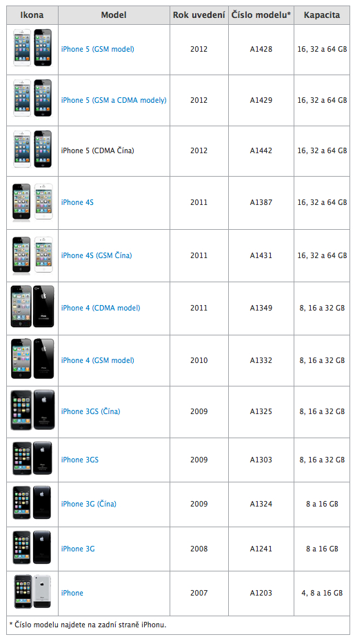 Následující přehled a tabulka pocházející z oficiálních stránek společnosti Apple na které nás upozornil čtenář Spirith obsahuje veškeré podstatné informace o jednotlivých mobilních telefonech iPhone, včetně tolik diskutovaných modelových čísel. Pokud si ani po shlédnutí tabulky a dalších informací nebudete jisti modelovým číslem svého telefonu, stačí se podívat na jeho zadní stranu.