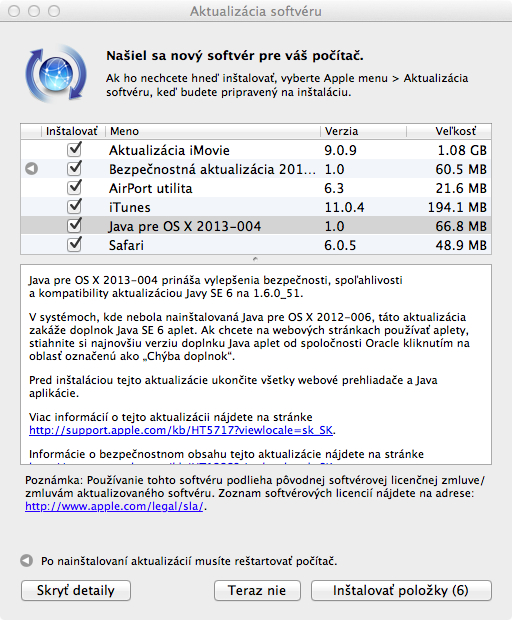 Aktualizace je zdarma dostupná prostřednictvím Software Update s velikostí okolo 70MB, podle jednotlivých verzí operačního systému OS X. Aktualizace označena jako Java pro OS X 2013-004 přináší zlepšení zabezpečení a spolehlivosti verze Java SE 6 1.6.0_51.