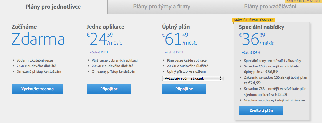 Být grafikem není ani zdaleka nejlevnější rozhodnutí na světě. Poté co si koupíte potřebný hardware, musíte získat také řadu fontů, obrázků a v neposlední řadě pak také aplikací. O tom, že společnost Adobe přešla z oblíbeného balíku Creative Suite na novinku Creative Cloud jsme vás již informovali v článku Adobe ukončilo vývoj Creative Suite a přechází na Creative Cloud. Zatím co první tisková zpráva Adobe hovořila o ceně 49,99$ za měsíční členství v Creative Cloud pro běžné uživatele kteří nemají žádnou předchozí verzi balíku Creative Suite, reálná cena kterou Adobe představilo na svých stránkách je trošku jiná.