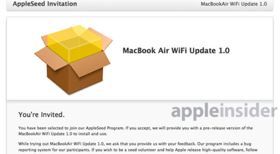 Nový update, ktorý by mal niesť pomenovanie MacBook Air WiFi Update 1.0, je softvérovým updatom pre nové modely MacBooku Air s procesorom Haswell. Apple chce svoj update testovať priamo u zákazníkov a tak sa rozhodol rozposlať niekoľkým majiteľom poškodeného MacBooku pozvánku do testovacieho programu AppleSeed. Účastníci tohto programu získajú k dispozícii testovaciu verziu aktualizácie WiFi Update. Aj keď je dnes update v testovacej fáze, Apple sa nevyjadril, kedy tento update vydá pre verejnosť. Či aktualizácia odstráni kód, ktorý znižoval rýchlosť pripojenia až o 39%, nie je známe. Ako sa zistilo, tento kód sa ukrýva v systémoch OS X 10.8.4 aj OS X 10.9, všeobecne by mal túto chybu odstraňovať až softvér OS X 10.8.5.