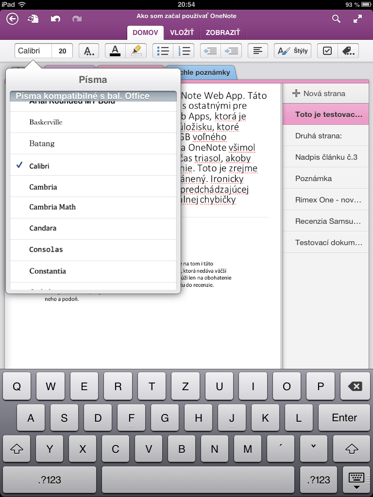 V prvej ponuke sa stretneme s veľmi obsiahlou ponukou písem. Microsoft myslí na všetko a rozhodol sa okrem štandardných písem v iOS ponúknuť aj písma, ktoré sú kompatibilné so sadou Office. V konečnom dôsledku teda vo verzii 2.0 nájdeme až 95 rôznych písem, pričom viac ako polovicu z nich tvoria tie, ktoré sú súčasťou iOS a tým pádom aj programov Pages, Numbers a Keynote. Novinkou je tiež možnosť zvýrazniť dôležité časti textu, a to jak s prednastavenými farbami, tak aj s farbou, ktorú si sami navrhnete. V ponuke Vložiť sa pre zmenu stretneme s možnosťou vloženia tabuľky, obrázku, snímku z fotoaparátu, dátumom či dokonca pribúda aj možnosť vložiť hypertextový odkaz. Možnosť tvoriť grafy ostáva aj naďalej exkluzivitou pre používateľov na počítači. Tá najväčšia a najpozoruhodnejšia inovácia však na nás čaká v ponuke Zobraziť. Tretia ponuka nielen, že ponúkne nastavenia zobrazenia, ale v neposlednom rade prináša aj možnosť kontrolovať pravopis vášho dokumentu. Prvýkrát v histórii kancelárskeho softvéru pre iOS sa stretávame s možnosťou kontroly pravopisu, s vecou, ktorú Apple behom takmer troch rokov nebol schopný pridať do svojich programov. Ale aj napriek tomu si používateľ môže všimnúť, že Microsoft vykonal iba polovičnú prácu a zvyšok nechal na používateľoch. Mnohokrát sa stretneme s podčiarknutím textu, ktorý je gramaticky správny, „naučiť“ nové slovíčka môžete OneNote tak, že zvýrazníte dané slovo a klepnete na tlačítko Naučiť, vďaka čomu ho už v budúcnosti nebude označovať ako chybné.