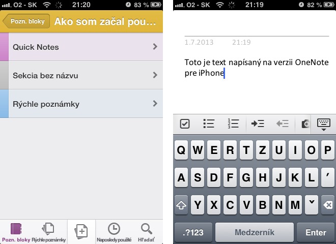 Pretože je iPhone zariadením s ďaleko menším displejom ako iPad, je len veľmi nepravdepodobné, že by mala aplikácia OneNote pre iPhone plnohodnotné rozhranie Ribbon UI a rovnaké funkcie ako ostatné verzie. Tento rozdiel je samozrejme očakávaný a už po spustení aplikácie a jej nastavením sa stretneme s programom, ktorého prostredie sa veľmi značne odlišuje nielen od OneNote pre iPad, ale aj od sady Office Mobile. Z toho usudzujem, že na aplikácii pracoval pravdepodobne iný grafický tím. OneNote pre iPhone ponúka možnosť rýchlo vytvoriť poznámky po stlačení tlačítka „+“ v strede spodnej lišty a ako zistíte, jedná sa skutočne o veľmi jednoduché a veľmi oklieštené možnosti editovania. Napriek tomu tu nájdeme možnosť vložiť obrázok, posunúť odsek, vytvoriť zoznam či zmeniť vzhľad používaného písma.