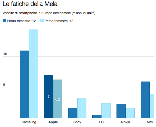 Podle odhadů analytiků společnosti IDC se Apple v letošním roce v Evropě zatím příliš nedaří. Zatím co v loňském roce se společnosti podařilo prodat za první tři měsíce roku v západní Evropě prodat 7 milionů iPhonů, v letošním roce je to za první tři měsíce o 800 tisíc telefonů méně. To znamená pro Apple meziroční pokles 11,5%, zatím co jeho největší rival Samsung nadále roste. Tomu se totiž za první čtvrtletí v roce 2012 podařilo prodat 10,9 milionů smartphonů, zatím co v letošním roce je toto číslo již 14,3 milionů chytrých telefonů. To navíc zapříčinilo pokles Applu o 5% na trhu chytrých mobilních telefonů v Evropě.