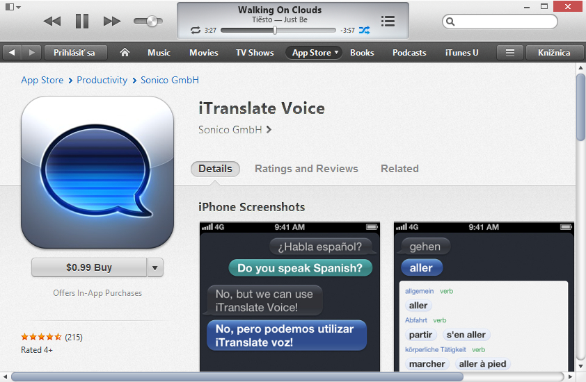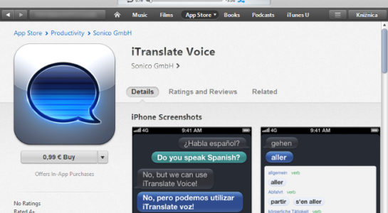 Aj napriek tomu sme si však všimli, že niektoré aplikácie stoja o ďalších 10 centov viac, čiže ich cena predstavuje 0,99€. Túto zaujímavosť sme si všimli u aplikácie iTranslate Voice, ktorú pracovníci Applu označili ako Editor’s Choice. Kým drvivá väčšina ostatných aplikácii stojí 0,89€, hlasový prekladač vás vyjde 0,99€. Podľa našich informácií sa jedná zatiaľ o jediný prípad, kedy došlo k zdraženiu aplikácie, no nie je vylúčené, že už čoskoro sa tak stane aj v prípade ostatných aplikácií a rozdiel medzi eurom a dolárom bude predstavovať pomer 1:1.