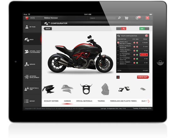 „Naším hlavním problémem bylo, že jsme měli několik různých komunikačních systémů,“ říká Mario Alvisi manažer prodejců. Informace sice v systému byly, ale nebyly koordinované a snadno se tak stalo, že měli obchodníci k dispozici v podstatě protichůdné údaje. Problém vyřešilo vybavení prodejní sítě iPady, ve kterých mají prodejci a další zaměstnanci k dispozici aplikaci s názvem DCS neboli Ducati Communication System. Aplikace s opravdu povedeným grafickým rozhraním umožňuje odesílat a přijímat veškeré informace, které jsou potřebné pro vytvoření a sledování zásilky a to dokonce v takovém rozměru, že prodejce ví zda je konkrétní díl již vyroben, připraven pro expedici, expedován nebo připraven k prodeji. Zákazníci si navíc přímo v aplikaci mohou postavit konfigurovaný motocykl s kompletním příslušenstvím a rovnou jej objednat.