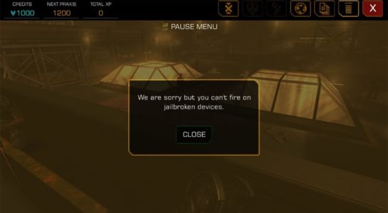 Během včerejšího rána jsme informovali o problémech, které mají hráči Deus EX: The Fall na jailbreaknutých zařízeních. Již během tutoriálu se totiž objeví informace o tom, že uživatele s Jailbreaknutým zařízením nemůžete ve hře střílet. To co je pro běžné uživatele sympatickým krokem jak zastavit pirátství na iOS je však problém pro ty, kteří si Jailbreak nainstalovali z důvodu, že chtějí využívat některé běžně nedostupné funkce na svém zařízení, ale hru si standardně zakoupili a zaplatili. Tyto uživatele totiž společnost Eidos hází do stejného pytle jako klasické piráty, jenž hru zdarma stáhli a porušili tak licenční smlouvu.