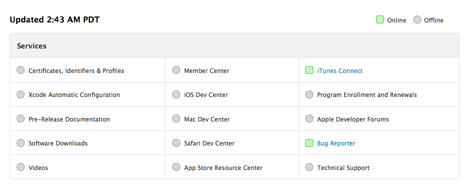 Vývojářské centrum společnosti Apple je již sedmý den offline. Aby společnost alespoň částečně zmírnila stoupající nervozitu vývojářů a investorů po hackerském útoku, spustila novou stránku vývojářského centra, na které se v reálném čase dozvíte, které funkce vývojářů jsou již obnoveny a mohou je začít používat. Online tak máte možnost sledovat co již funguje a co je stále off-line. V době psaní tohoto článku (25. 7. 2013 v 11:40) je online ze všech funkcí, které Apple svým vývojářům nabízí zatím pouze iTunes Connect a Bug Reporter.