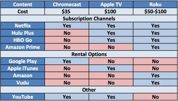 Server Marketingland.com zveřejnil tabulku, která ukazuje přímé porovnání Apple TV, Google Chromecast a Roku. Na představení novinky Google Chromecast se můžete podívat přímo zde a recenzi Apple TV pak najdete zde.
