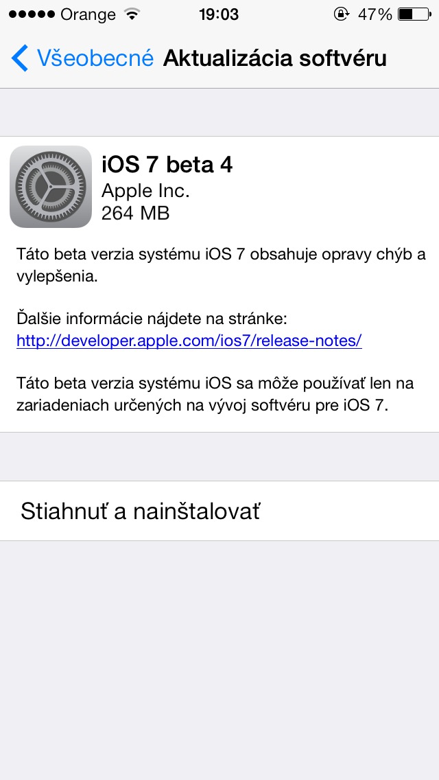 Po obnovení vývojárskeho centra sa Apple rozhodol vydať v poradí už štvrtú beta verziu svojho mobilného systému, ktorý navždy zmení vzhľad našich iPhonov a iPadov. Štvrtá beta prichádza až tri týždne po vydaní tretej beta verzie iOS 7 a predovšetkým opravuje chyby v systéme, ako aj vylaďuje jeho optimalizáciu pre všetky zariadenia. iOS 7 beta 4 je možné stiahnuť v tejto chvíli stiahnuť iba OTA v nastaveniach systému, avšak behom pár minút bude dostupná aj na oficiálnom developerskom portáli.