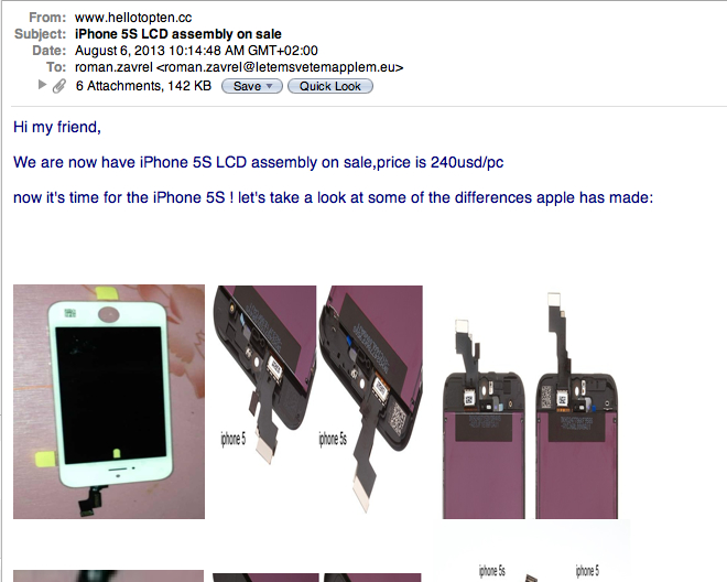 Update: Dvojice čtenářů nás upozornila na fakt, že fotografie zveřejnil již před časem server fanaticphone.com. Bohužel fotografie dnes ráno dorazily do našeho mailu s tím, že pochází od prodejce náhradních dílů pro produkty společnosti Apple. Screenshot mailu je přidán v článku a fanaticphone.com jsem osobně kontaktoval s omluvou. Fotografie dorazily bez jakéhokoli označení nebo watermarku a proto jsme je zveřejnily, serveru fanaticphone.com se omlouvám.