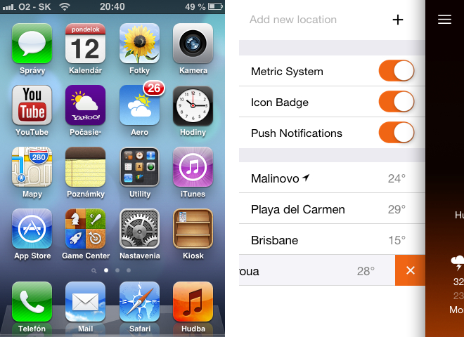 Nová aplikácia nesie pomenovanie Aero, a zakúpiť si ju môžete iba za 89 centov. Aplikácia si berie značnú inšpiráciu z tej na iOS 7 a to vidíme už po spustení aplikácie. Aplikácia totiž ponúka veľmi čisté užívateľské prostredie, ktoré sa farebne prispôsobuje času v lokalite. Čas je navyše možné vidieť na vrchu obrazovky spolu s dvojicou tlačidiel. Ľavé tlačítko predstavuje odkaz na nastavenia, ktoré sa celkom svižne vysunú z ľavej časti obrazovky. Tu si môžu používatelia všimnúť, že aplikácia používa tie isté posuvníky ako iOS 7, avšak tentoraz sú v oranžovej farbe.