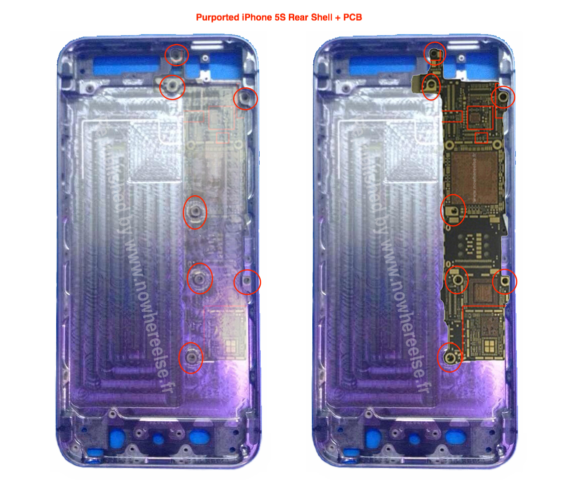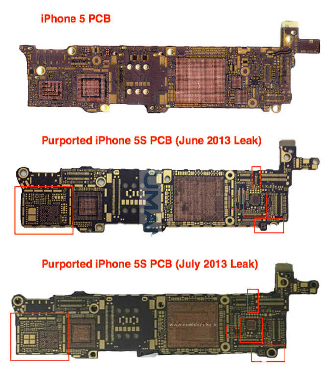 Tomuto úniku pomáhajú na pravdivosti aj fotografie základnej dosky z iPhone 5S, ktorá perfektne zapadá do vnútra tela prístroja. Server totiž zverejnil fotografie základnej dosky, v tom čase ale nebolo možné potvrdiť, či sa jedná o originálny komponent alebo o podvrh. Už v minulosti sa totiž dostalo na internet niekoľko fotografií, ktoré ukazovali falošné komponenty, autori ich však opisovali ako pravé. Tento leak nám ale ukazuje, že Apple skutočne hodlá zmeniť aj tlačítko Home Button. Kovová doštička je teraz asymetrická, a preto je možné, že sa vnútri telefónu skutočne udejú zmeny, vďaka ktorým telefón ponúkne snímač odtlačkov prstov. Fotografie zverejnil francúzsky portál Nowhereelse.fr.