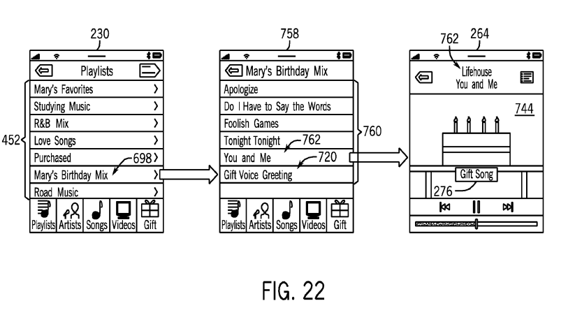 Apple vo svojom patente tvrdí, že používatelia by mohli takto posielať digitálnu hudbu cez NFC, a príjemca musí byť pripojený k internetu – pokiaľ nie je, telefóny si medzi sebou vymenia informáciu o tom, že si príjemca stiahne digitálny obsah z iTunes Store ihneď ako sa pripojí k internetu. Funkcia by bola hlboko integrovaná už do aplikácie Hudba, kde by sa pod každou zakúpenou skladbou nachádzalo tlačítko, ktoré by ponúkalo práve možnosť darovať skladbu ďalšiemu užívateľovi. Posielanie súborov by mohol užívateľ obohatiť aj o rôzne zaujímavosti, napríklad o fotografiu torty a zdôrazniť, že užívateľ získal skladbu alebo playlist ako narodeninový darček. Samozrejmosťou je následné uloženie skladby na jeho Apple ID a iCloud. Apple zažiadal o registráciu patentu už v marci/březnu 2013, a nesie označenie 2013/0211971.