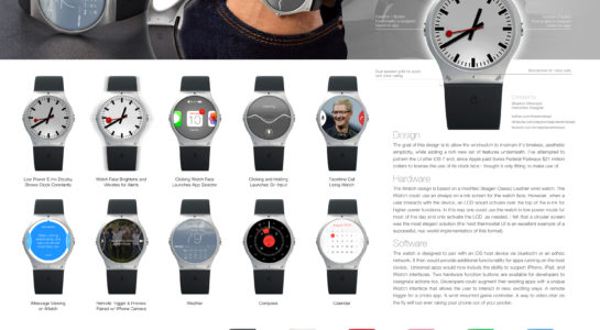 Videli sme už mnoho konceptov inteligentných hodiniek iWatch od spoločnosti Apple, avšak tento je podľa môjho názoru práve ten najvydarenejší. Koncept veľmi príjemne spája koncept elektroniky a klasických náramkových hodiniek, čím znázorňuje pomerne vysoký level elegancie a luxusu. Autori konceptu od hodiniek očakávajú, že Apple k ním ponúkne polyeuretánový remienok, podobný ako dnes používa u obalov Smart Cover pre iPad a iPad mini. Dizajn hodiniek iWatch je postavený na báze Skagen Leather Classic.