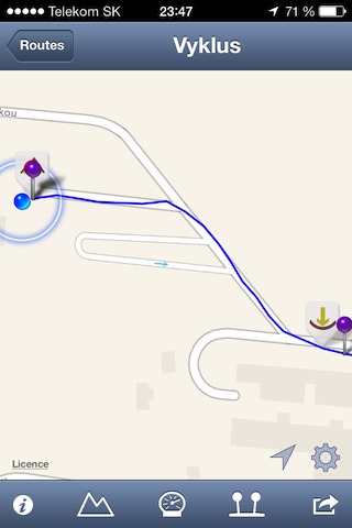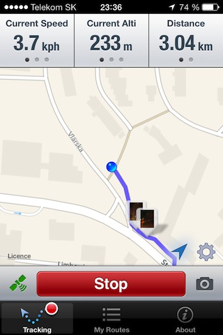 Pod mapou můžete aktuálně vidět stav GPS signálu s tím, že pokud svítí družice zeleně, je vše v pořádku a jste připojeni k GPS, pokud je červená, telefon s GPS aktuálně nekomunikuje. Pomocí tlačítka Start/stop zapínáte měření tratě a pomocí ikonky fotoaparátu můžete vyfotit snímek na trati, který se následně automaticky přidá do mapky a samozřejmě jej také můžete přidat do camera roll. Mapu lze zobrazit jako hybridní, klasickou nebo satelitní a přiblížit tak, jak jste zvyklí u klasických Google Maps. Mapy je možné předem načíst jejich zobrazením, pak pro tuto oblast není potřeba internet. Údaje o nadmořské výšce jsou také přístupné i bez internetu.