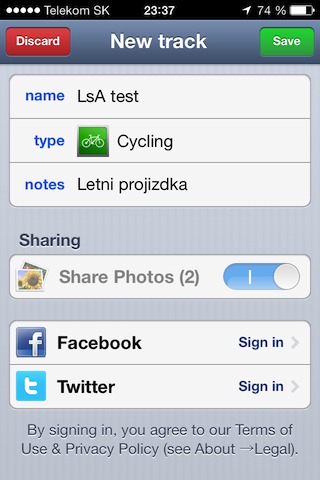 Po dokončení trati, můžete svoji novou trasu uložit a rovnou také sdílet na sociálních sítích Facebook a Twitter. Při ukládání je samozřejmě možné trať pojmenovat a vybavit tkaé poznámkou například o počasí, které při vaši jízdě nebo běhu panovalo. Kromě toho je možné také vybrat ikonku podle které okamžitě víte zda jste trať absolvovali například na kole, kolečkových bruslích, v letadle, pěšky nebo na lyžích a mnoha dalších dopravních prostředcích. Uložené tratě můžete následně zobrazit na mapě, na které vidíte kromě vámi vytvořených bodů nebo fotografií také body, které aplikace do trati zanáší sama. Okamžitě tak vidíte ve kterém úseku jste dosáhli největší rychlosti nebo například největšího převýšení.
